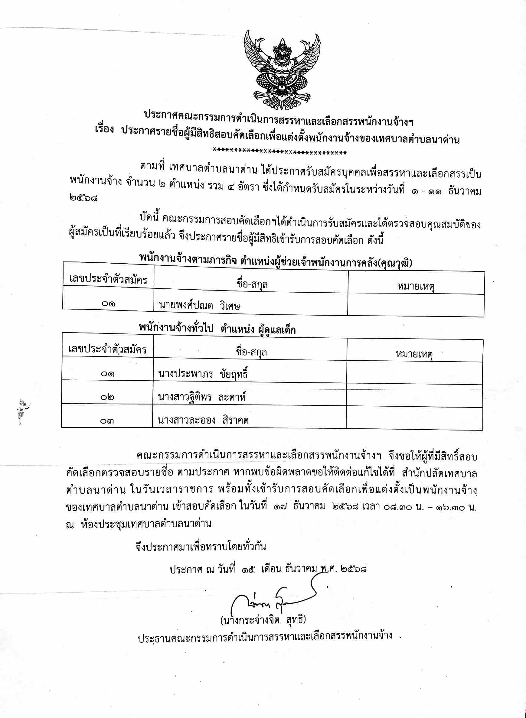 ประกาศรายชื่อผู้มีสิทธ์สอบคัดเลือกเพื่อแต่งตั้งพนักงานจ้างของเทศบาลตำบลนาด่าน |
